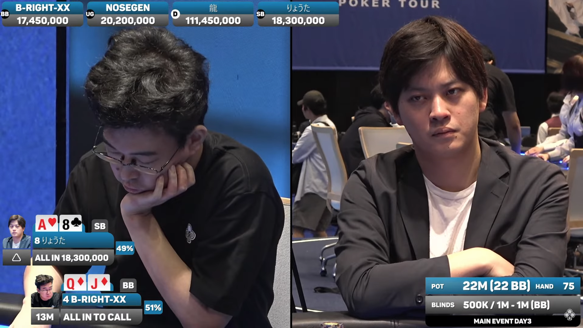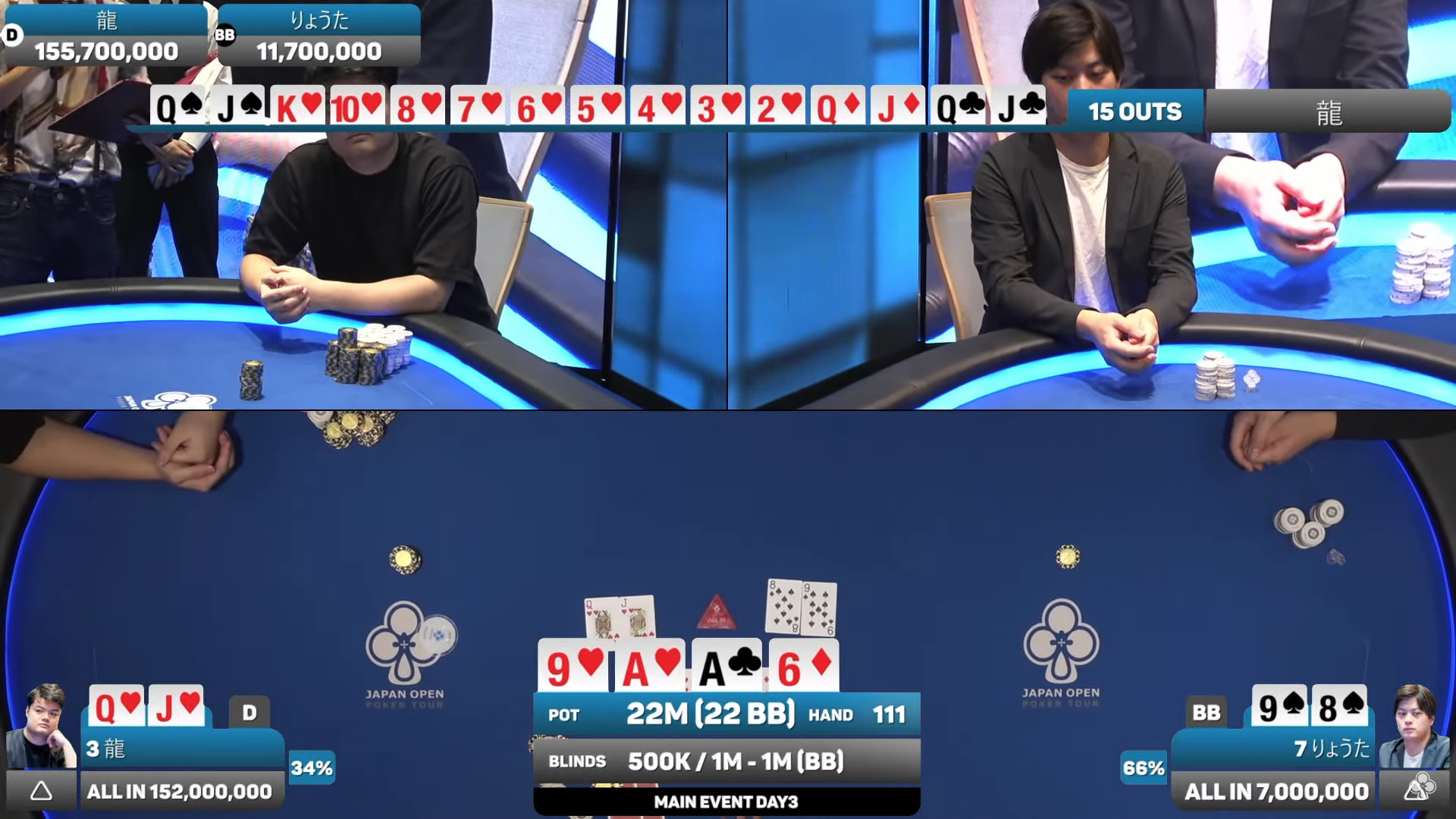 また、りょうたさんがSBでリンプ1m、自分がBBでQJsを持っていてレイズ3mにオールイン返されたところで、こちらも残り4人でA8oをオールインできるとは思っていなかったので配信見返して驚きました。
