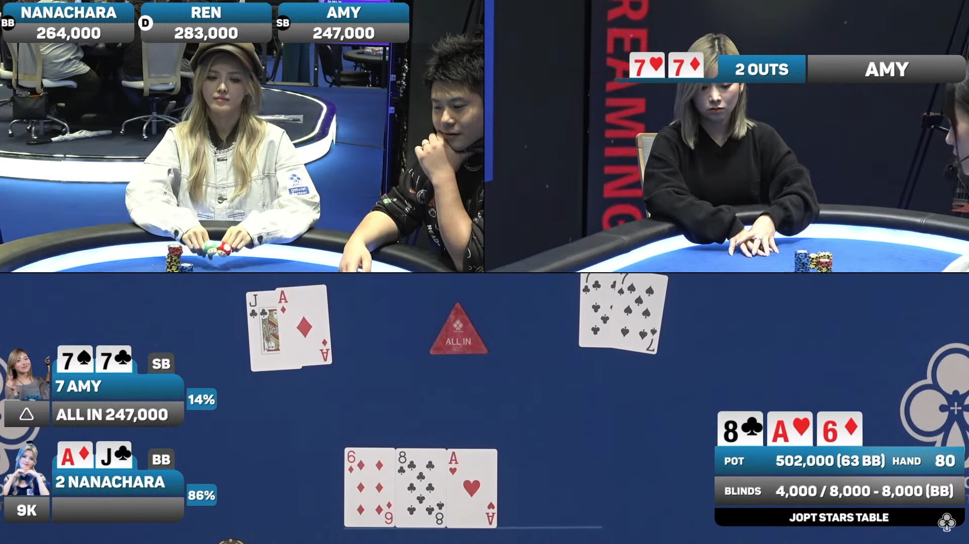 それは、ななちゃらさんがオールインして、私が77でコールしたら、AJが出てきて…。