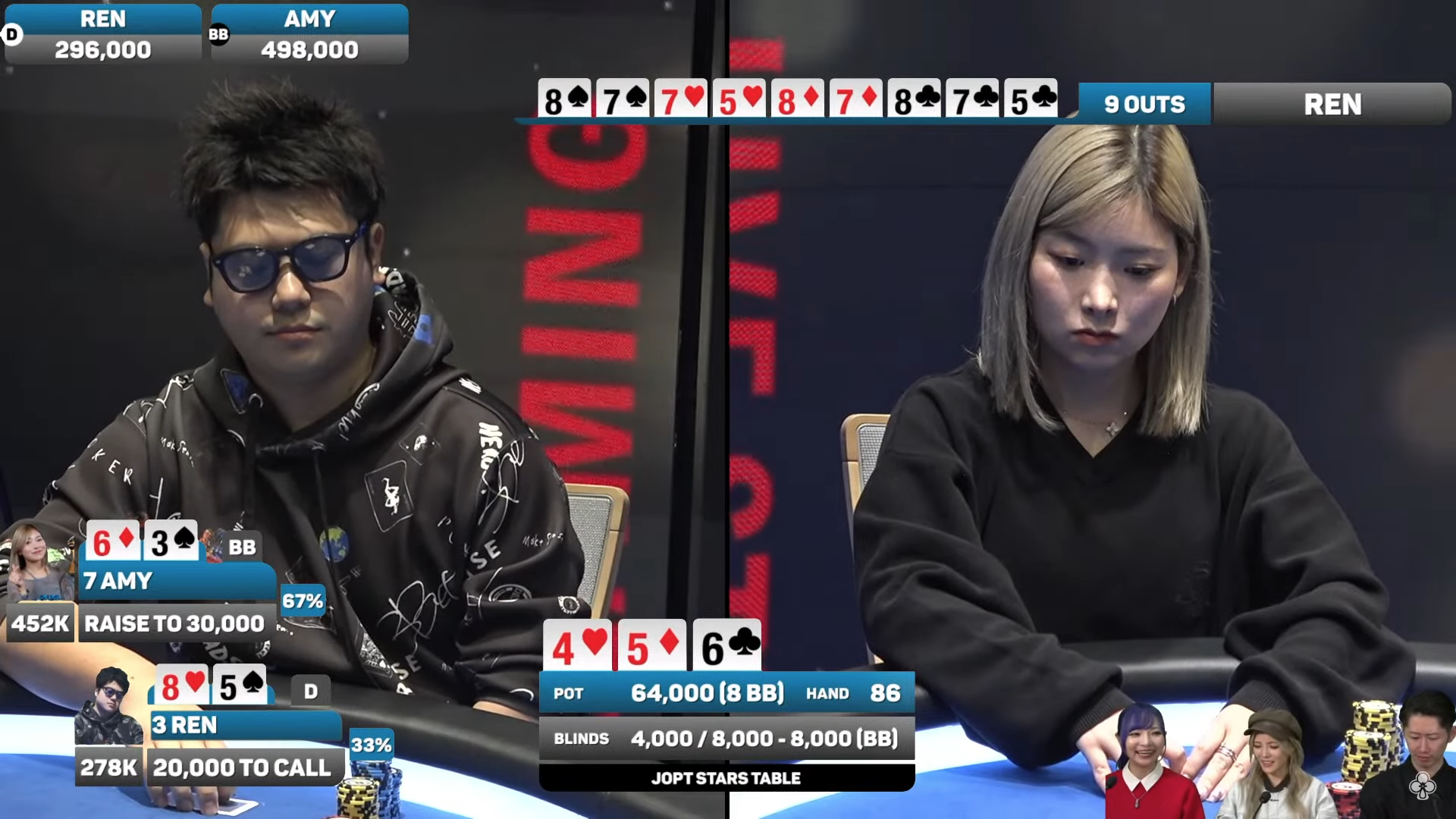 レンさんの配信は以前からよく見ていたので、プレイスタイルはある程度把握していました。なので、「レンさんとヘッズアップになれば、しっかり実力を出せるかもしれない」とは思っていましたね。印象的だったのは、私がトップヒット・オープンエンドのドローから、ターンでストレートを完成させたハンドです。フロップから強気にレイズして、ターンで完成した後も3発打ち切ってポットを獲ることができました。最後の優勝を決めたハンドは、一瞬勝ったのか負けたのか分からなくなるくらい、あっという間でした(笑)。