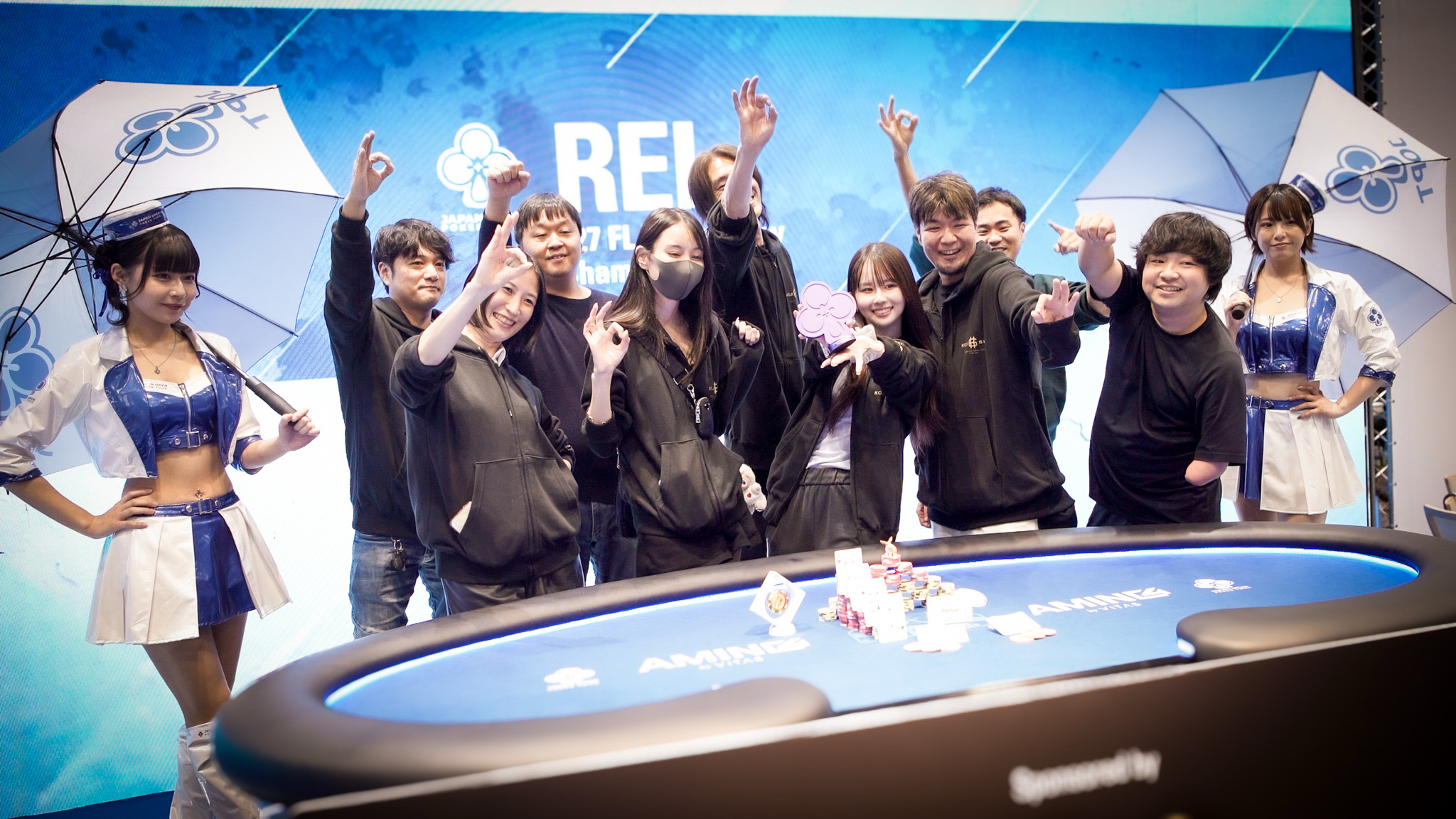 はい。今回のJOPTでは、師匠のKojiさんも#18 10 Game MIXで優勝しましたし、弟子の1人のまさるさんはFL 2-7 TD & Badugiで、企画の裏方をしてくれているマネージャー的な存在の人もPL Big-Oで優勝しました。 なので、チーム全体で今回のミックスゲームのトロフィーを4つも持って帰ってくることができました。