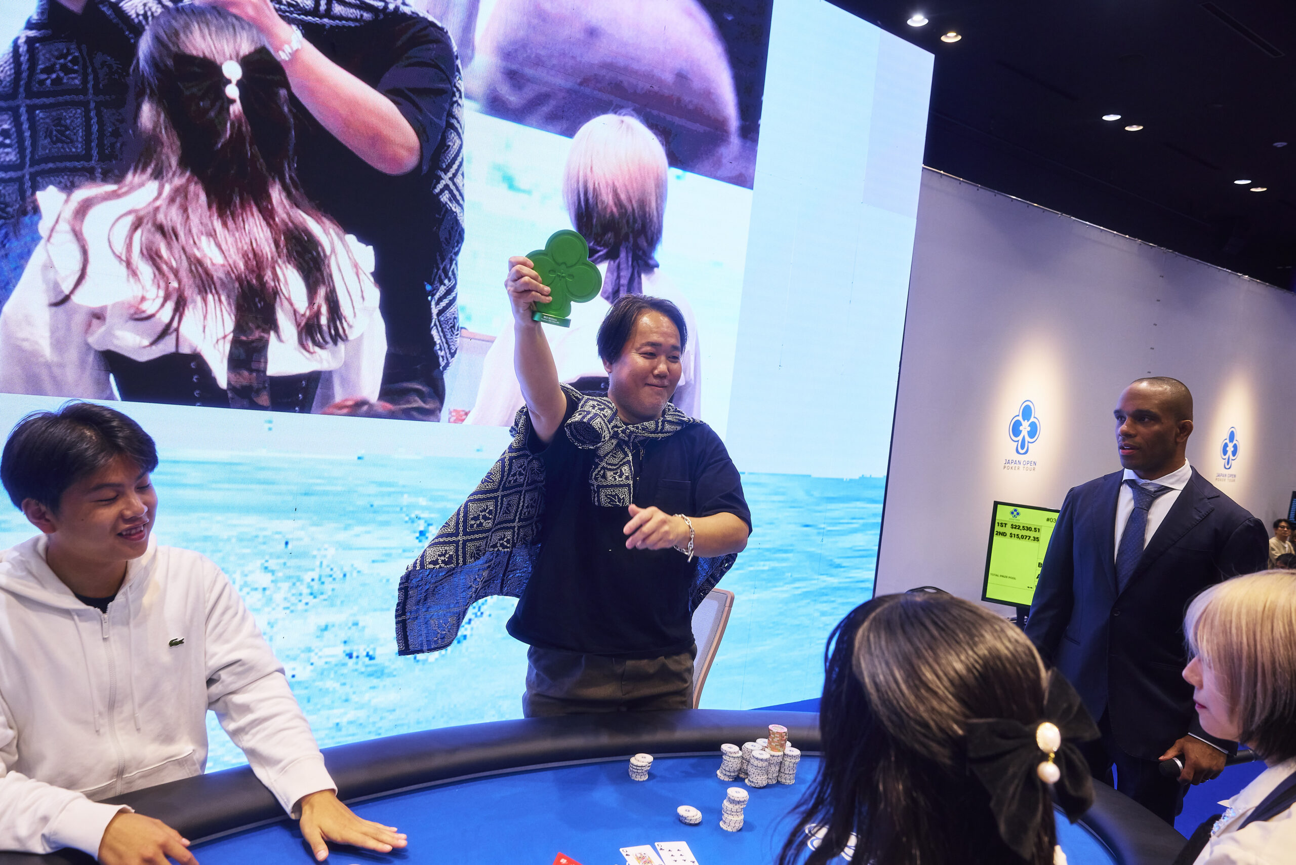 はい、2つあります。1つ目はDay 1のラストハンドです。その時、持ち点は4万点ほどしかなく、このままDay 2に進んでも厳しい戦いになることは目に見えていました。そこで「ここで勝負をかけよう」と決意し、KQでオールインしたんです。相手はJJで、厳しい状況でしたが、ボードにKが2枚落ちてくれて、奇跡的にダブルアップすることができました。あそこで生き残れたことが、今回の優勝に繋がる大きなターニングポイントだったと思います。