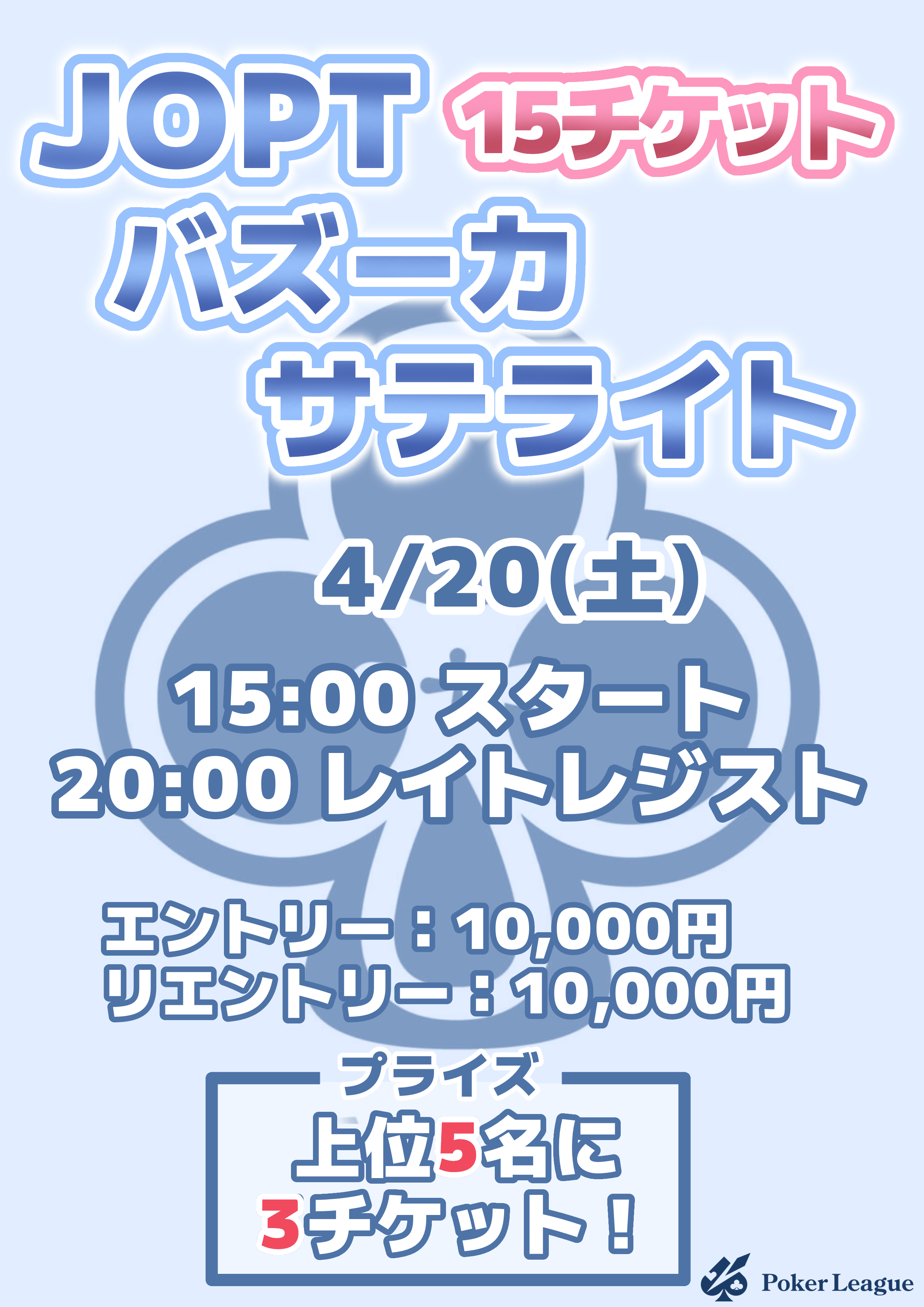 | 11/11(火) | 17:45 | 【JOPT 15チケット】メガサテライト | GoodGame Poker Live Shinjuku |
