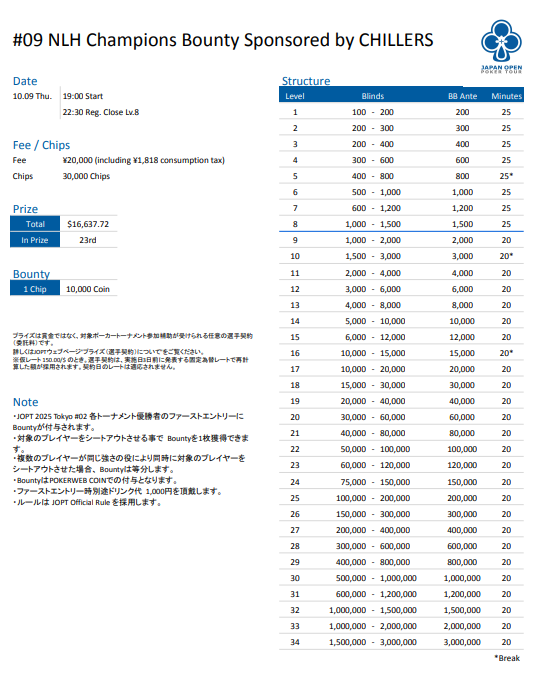 10/9(木) | 19:00 | 【JOPT】NLH Champions Bounty Sponsored by CHILLERS | JAPAN OPEN POKER TOUR |
