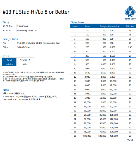 10/21(火) | 18:00 | 【SPADIE上位2名2枠】CLT Original Tournament | Casino Live Tokyo |