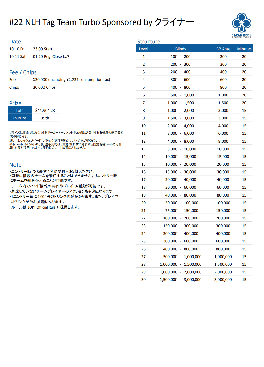 10/10(金) | 23:00 | 【JOPT】 NLH Tag Team Turbo Sponsored by クライナー | JAPAN OPEN POKER TOUR |