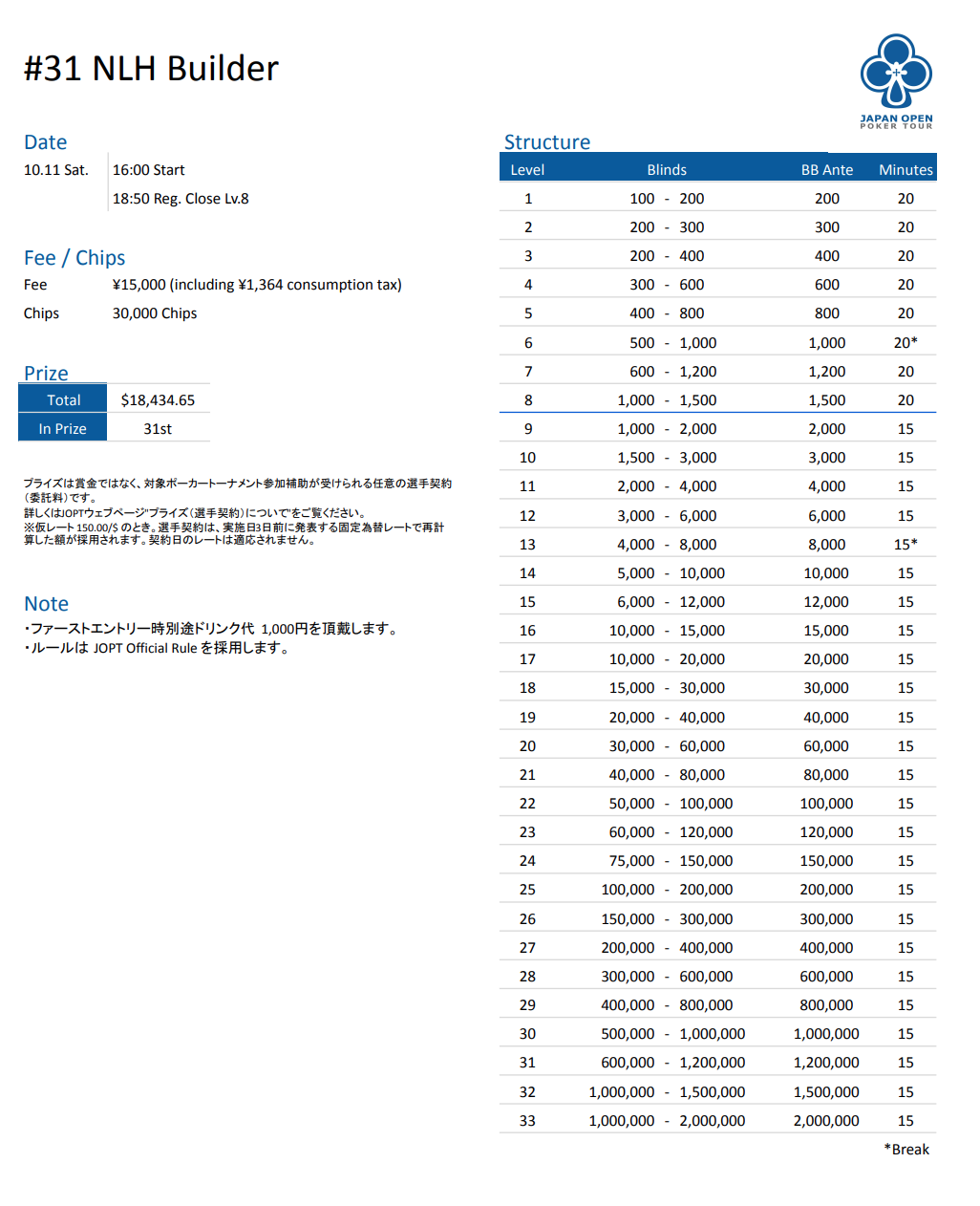10/11(土) | 16:00 | 【JOPT】 NLH Builder | JAPAN OPEN POKER TOUR |