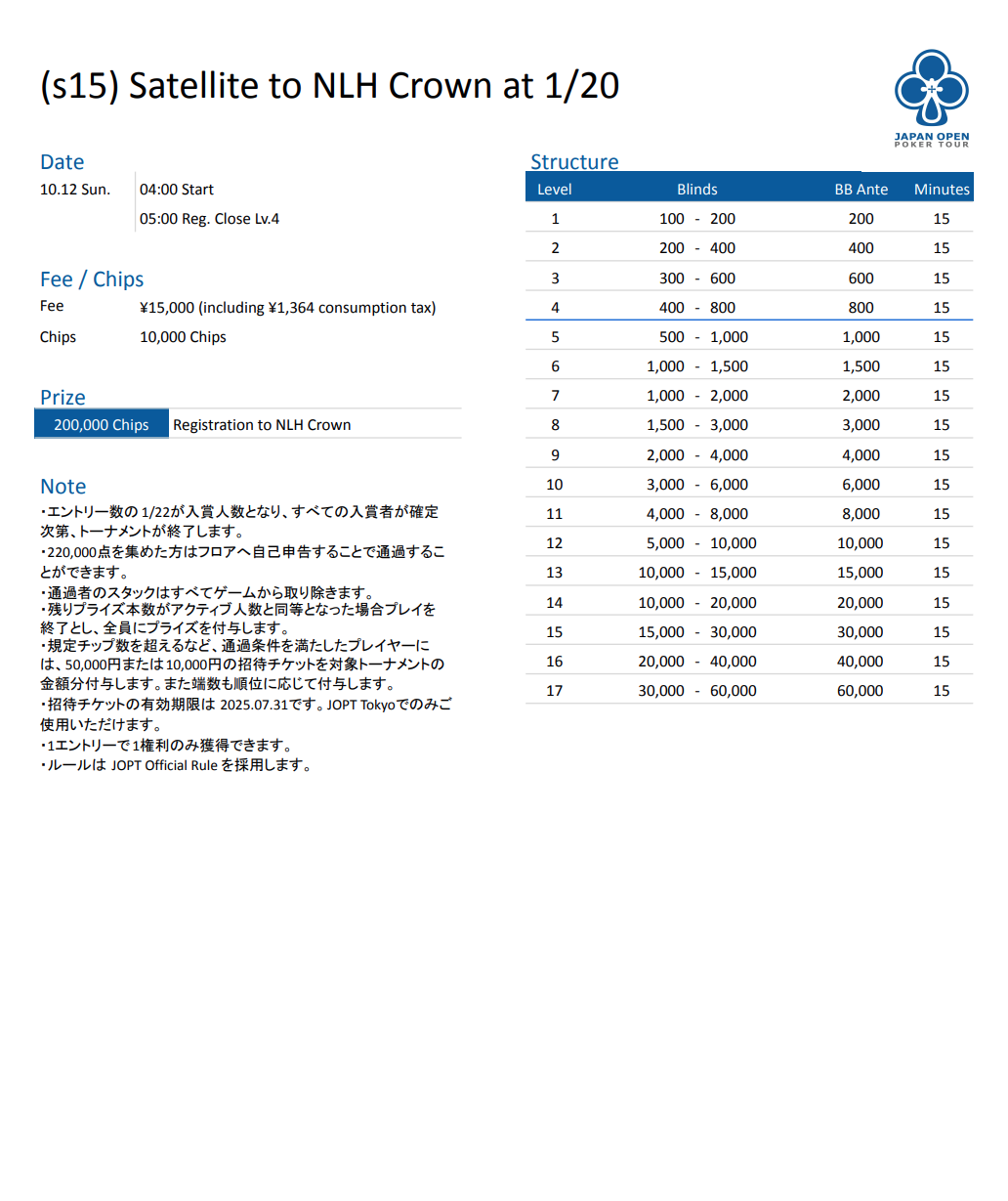 10/21(火) | 17:45 | 【上位5名合計15チケット】JOPTメガサテライト | GoodGame Poker Live Shinjuku |