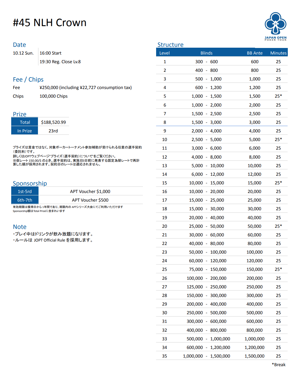 10/12(日) | 16:00 | 【JOPT】 NLH Crown | JAPAN OPEN POKER TOUR |
