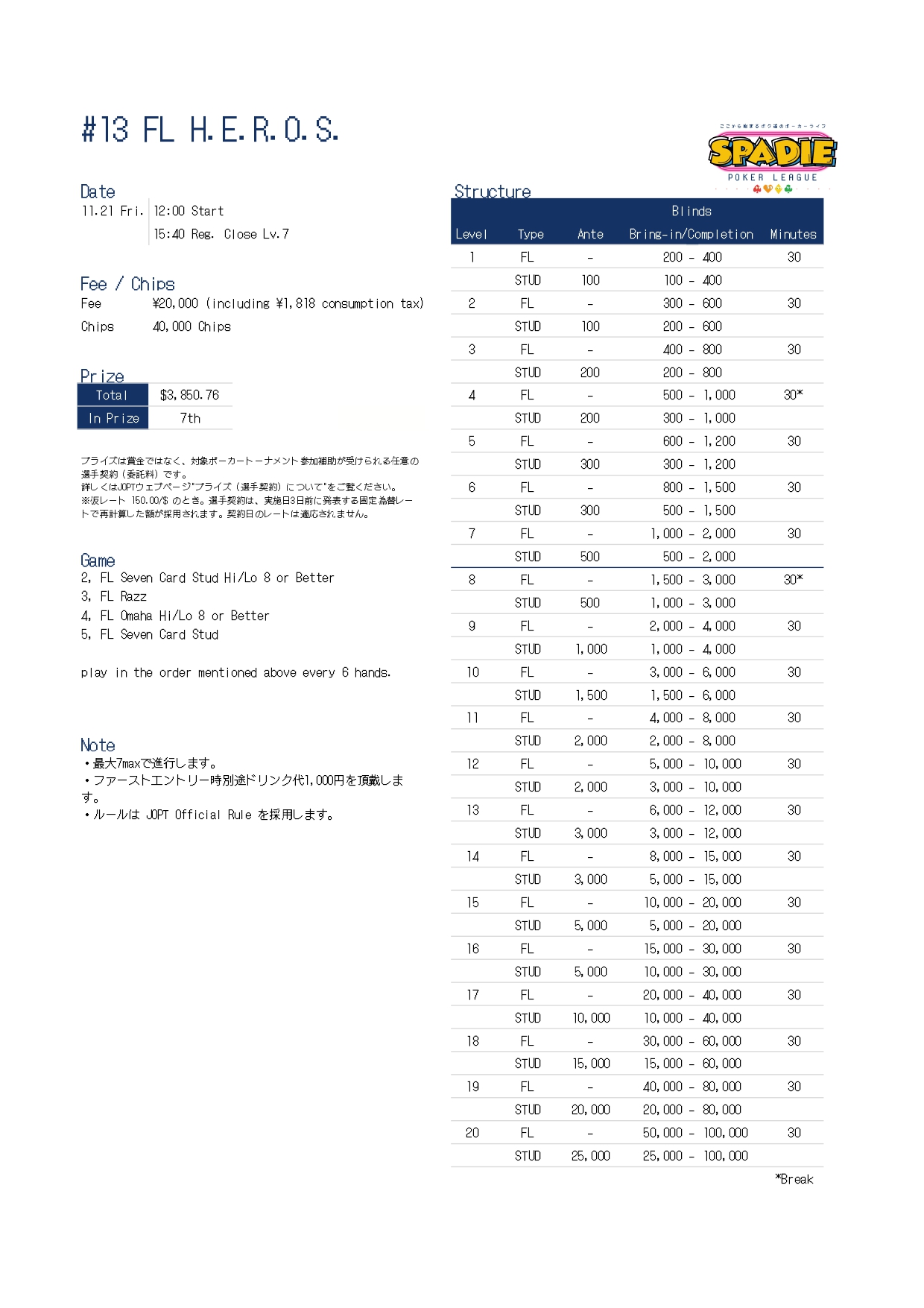 | 11/15(土) | 17:00 | 【上位1名 SPADIE 39th Disco☆Twins -Couple Tag Team- Voucher】H... | GoodGame Poker Live Shinjuku |