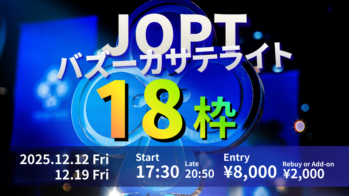 | 12/16(火) | 18:00 | 【JOPT 21チケット】サテライト 毎週火曜日開催✨ | GoodGame Poker Live SHIBUYA |