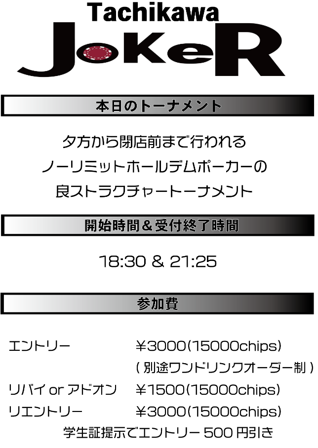 | 12/15(月) | 18:00 | 【JOPT 15Ticket】メガサテライト | Casino Live Tokyo |
