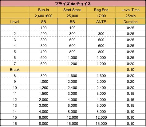 | ゲーム | 25,000点 / ノーリミット / テキサスホールデム / 15Min / TDP ポイント表 |