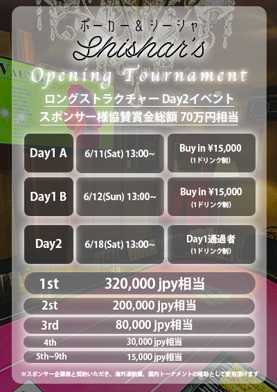 シーシャーズのオープニングを祝して、総額70万円相当の2Days制トーナメント実施します。
