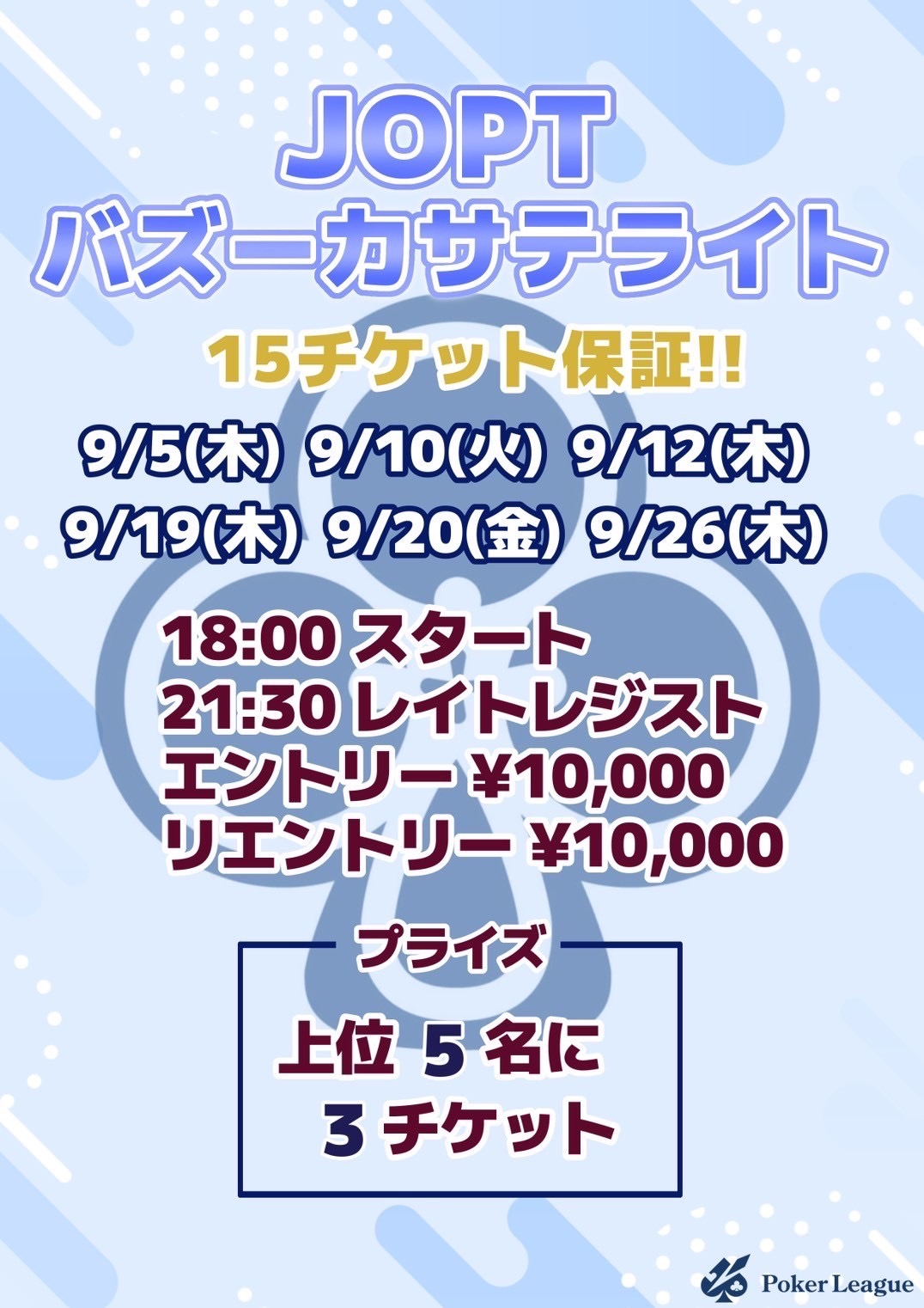 | 11/22(土) | 18:00 | 【SPADIE FINAL 39th】#26 NLH Lucky Clover -Mystery Bounty- | JAPAN OPEN POKER TOUR |