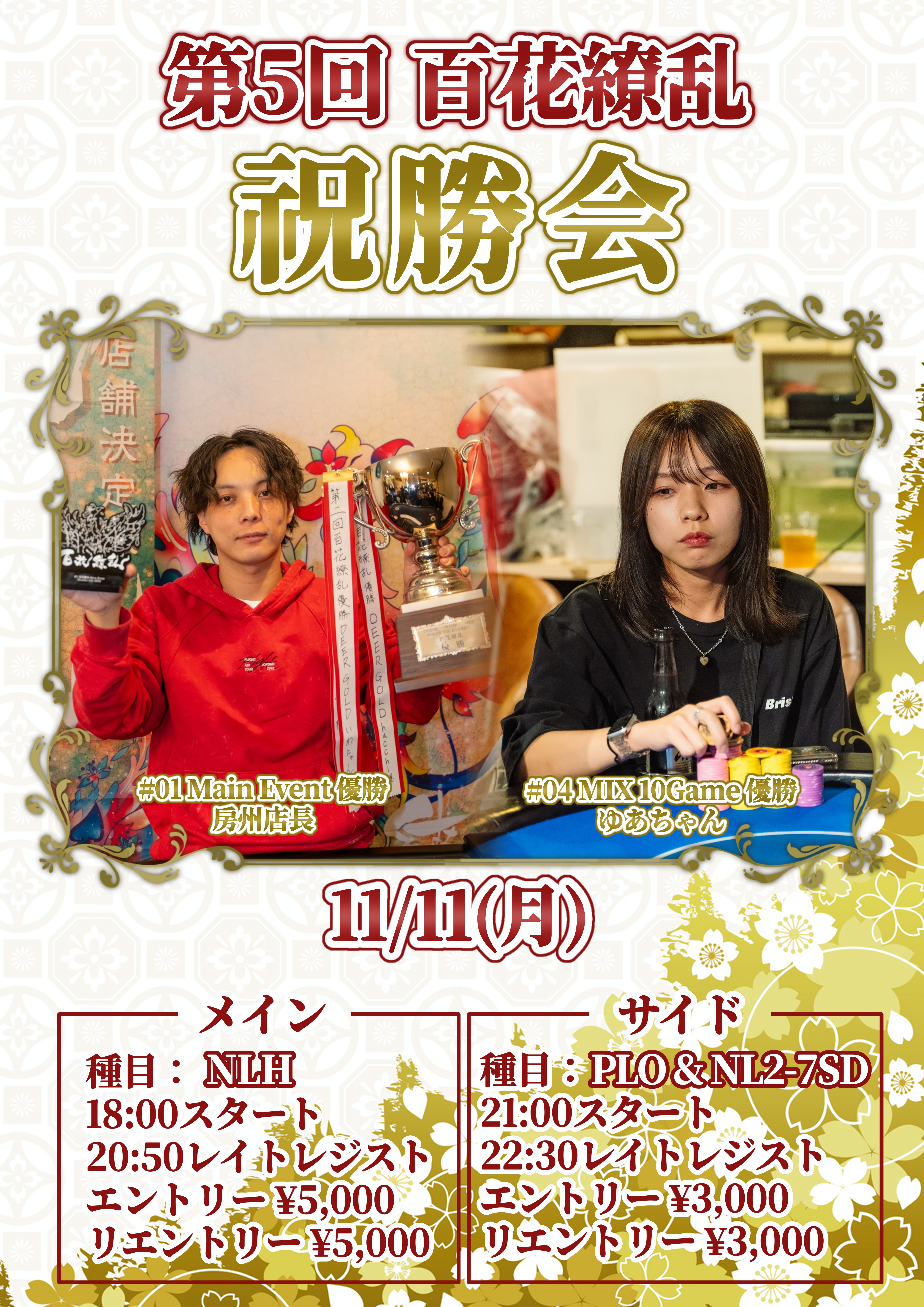 | 11/23(日) | 11:00 | 【SPADIE FINAL 39th】#33 NLH Legacy / Day 1A | JAPAN OPEN POKER TOUR |