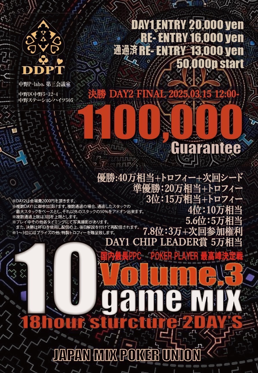| 11/23(日) | 13:00 | 【SPADIE FINAL 39th】#34 NLH Megastack | JAPAN OPEN POKER TOUR |