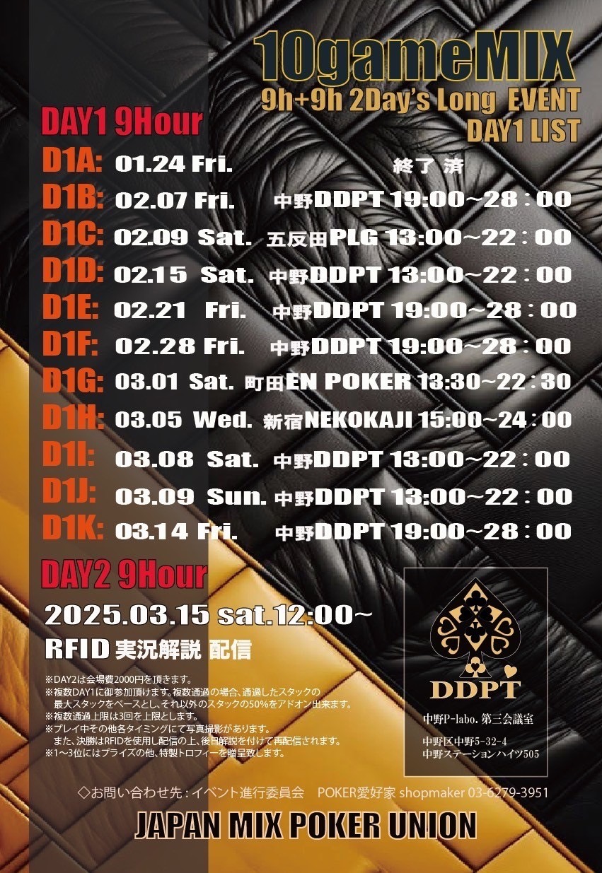 | 11/22(土) | 13:00 | 【SPADIE FINAL 39th】#24 NLH Deepstack | JAPAN OPEN POKER TOUR |