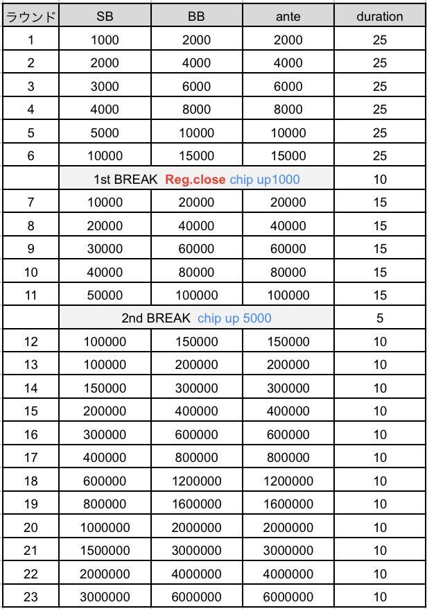 ※TD権限によりタイマースタート、ブラインド、ストラクチャーの変更となる場合がございます。