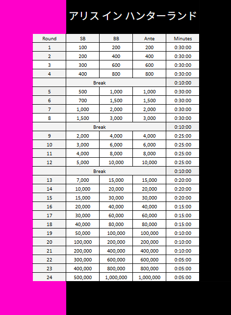 ゲーム | 15,000点 / ノーリミット / テキサスホールデム / 20Min. / 使用しない |