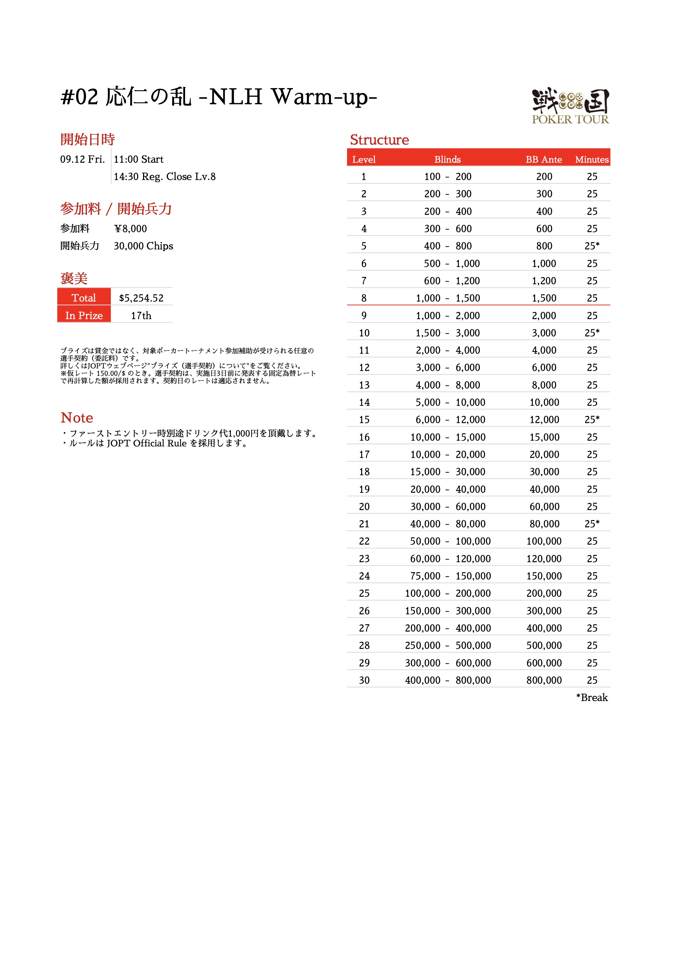 | 10/30(木) | 15:00 | 【JOPT Osaka】#02 NLH Warm-up | JAPAN OPEN POKER TOUR |