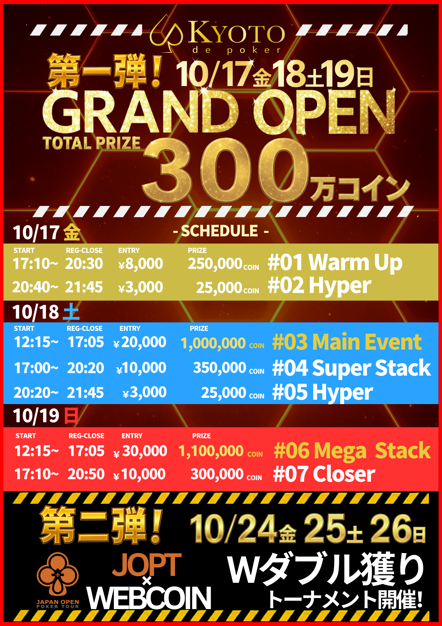 10/17(金) | 17:30 | JOPT バズーカーサテライト8K 21枠 | KKLIVE POKER SHIBUYA |