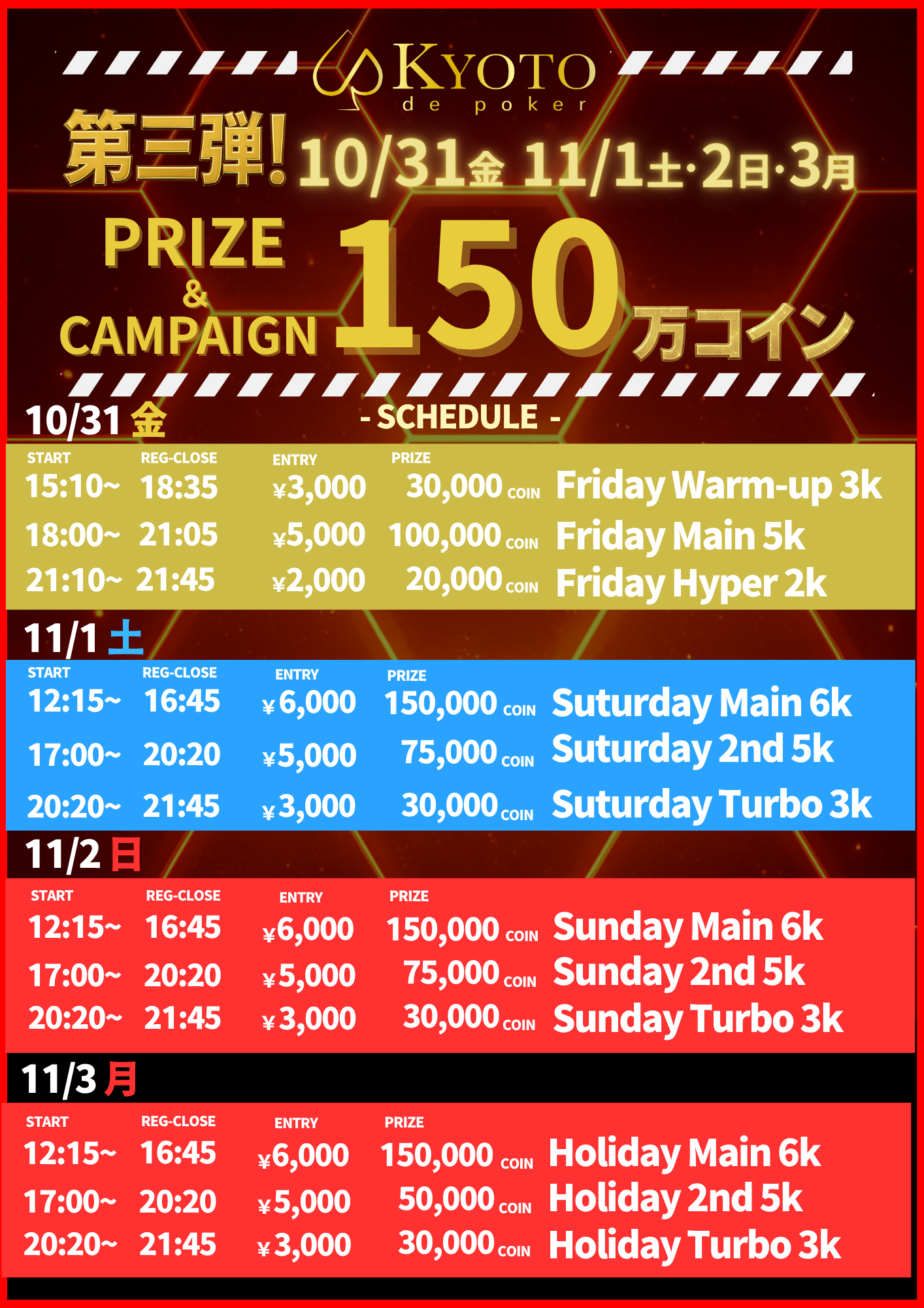 | 11/3(月) | 17:00 | 【上位2名SPADIE2枚】Holiday Monster Stack 5K | GoodGame Poker Live Shinjuku |